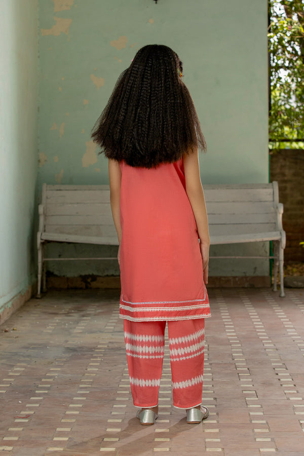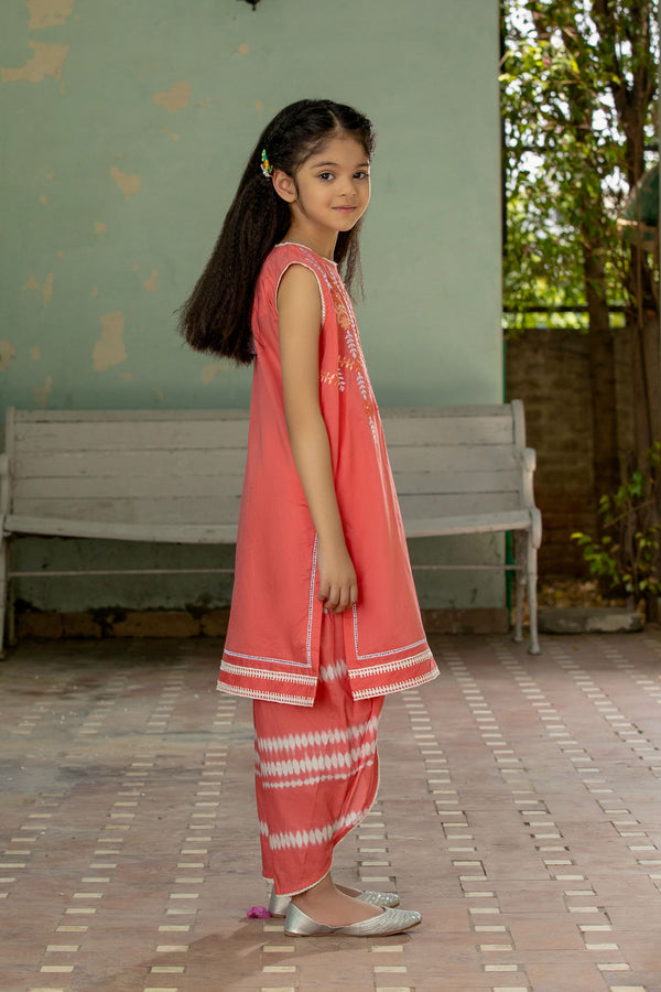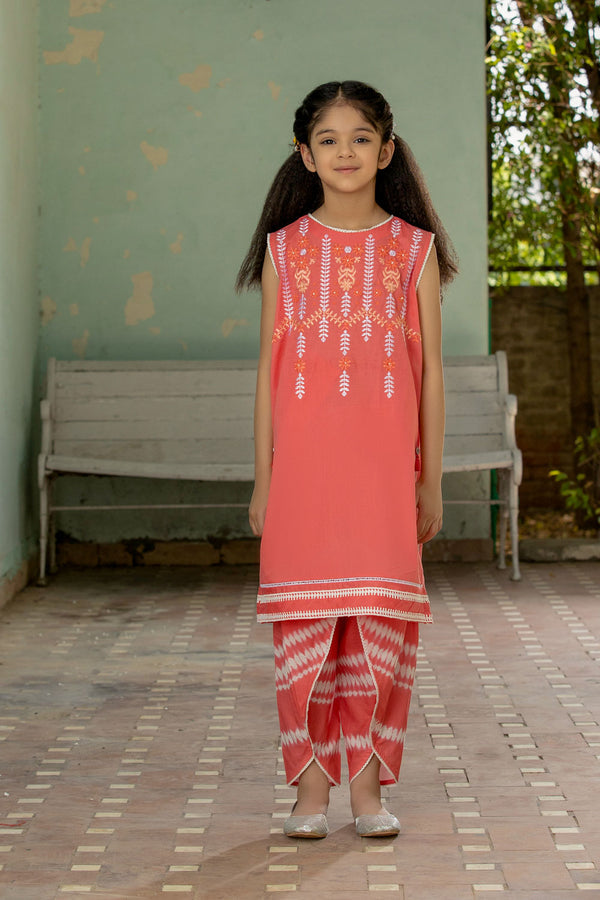 Adorn your little one in this embroidered peach two piece lawn suit, with a kurta decorated in tassels and a printed tulip shalwar.